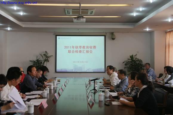17日上午,检查组来到我校召开了“2011年秋季教育收费联合检查汇报会”,学校党政领导项家祥、赵佩琪、程龙根、尹雷方、王玉及相关部门中层干部出席了会议。校长项家祥在汇报会上对学校教育收费工作进行了自查汇报,报告从七个方面针对我校规范收费、规范管理、规范教育做了系统的归纳及阐述,同时他也以热忱的态度对检查组的莅临检查指导工作表示由衷地欢迎。