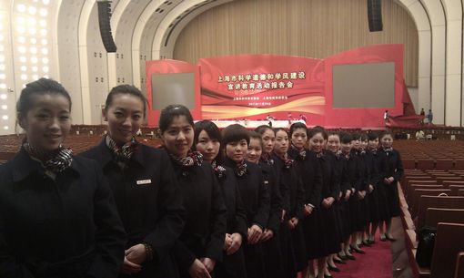 11月29日,上海高校“科学道德和学风建设”宣讲教育报告会在世博会议中心隆重召开,市委、市教委以及高校领导、专家学者和部分高校研究生、博士生代表出席了此次会议。我院航空运输系礼仪队学生特邀作为此次活动的礼仪和志愿者,主要负责会议入场引导、会场内引导、领导和专家接待、车辆秩序维持等。有三名学生代表高校的学生分别向到会发言的三位院士献花。学生们穿着统一的制服,根据组委会的安排,出色完成此次礼仪服务任务。