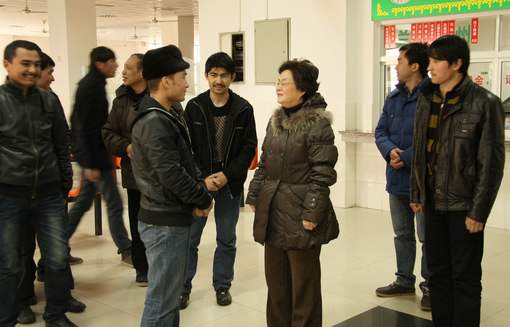2月的上海初寒乍暖,18日下午29名新疆籍同学经过长途旅程,终于在火车站见到了“东海学院”亲切的接站校车,吉老师安排他们有序上车。在开往学校的路上小憩之后,校车径直开到了学校的食堂门口,校党委书记赵佩琪、后保部康建华、曹炳荣、学工部蔡建平、丁丽老师已经早已等候迎接着他们的到来。