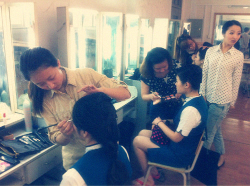 5月11日,我校第三届文化艺术节开幕式拉开序幕,艺术学院的形象设计专业2010级学生郑李莉、杨力、梁乐听为此次艺术节开幕式的演出同学提供了优质的化妆服务。这几位同学从早晨8点钟开始忙碌着化妆,补妆,认真而详细,一直坚持到中午12:30分,临近午饭时间,她们轮流换班吃饭,生怕离开了会耽误演出同学的时间。尽显风采的《时装秀》、优雅浪漫的舞蹈《爱神的箭》、激情澎湃的诗朗诵《永远跟党走》、饱含深情的女生合唱《高原红》演员及开幕式主持人共60多位同学的精彩表演,都凝结了幕后化妆同学的辛勤劳动。