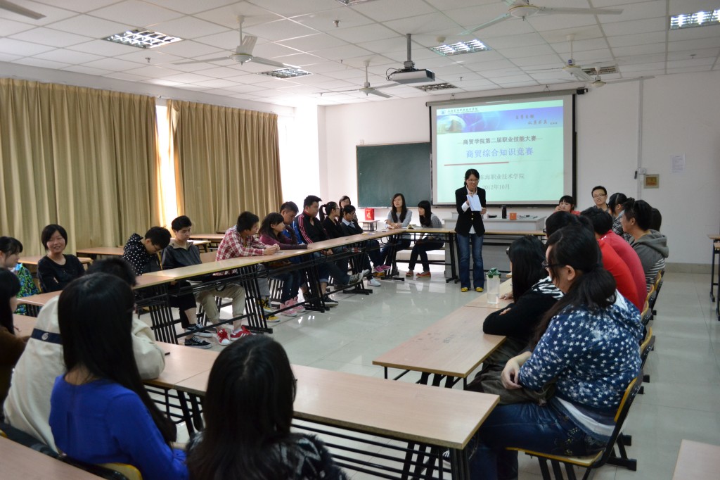 10月24日,商贸学院举办了丰富多彩的商贸综合知识竞赛,担任评委的有李福刚,王慧,徐美红,果云霞,胡艳华老师,时启亮院长作为嘉宾观看比赛,对表现出色的参赛学生,院方会给予德育成绩加分。此次比赛共有47人报名参赛。