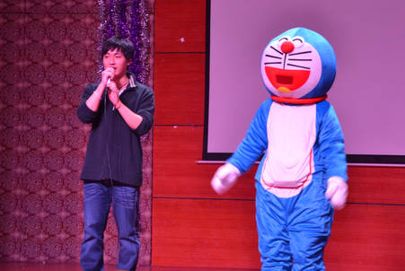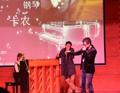 演出一开场,我院艺术团成员何湾同学高歌一曲《上海滩》,时而铿锵有力,时而温柔婉约的嗓音,仿佛带着大家回到那个风起云涌、豪气干云的大上海;钢琴曲《卡农》配上现场B-BOX,美女与帅哥的组合,古典与时尚的搭配,不仅让人眼前一亮,还让大家不得不惊叹演员们配合的默契和技艺的精湛。整场晚会节目形式丰富多彩。除了唱歌、跳舞以外,魔术、朗诵、话剧、相声等都给观众留下了深刻的印象。首次登场的投影秀表演——《那些年》,一盏灯、一张幕,幕后投影出的那一段段景象,不正是我们校园生活的点点滴滴吗?那熟悉的身影、那熟悉的场景,勾起了即将离开校园的同学们的缕缕回忆。每年的晚会上,抽奖环节总是让人期待。今年的晚会,我们请来了功夫熊猫和哆啦A梦助阵。它们的上场,让场下观众爆发出热烈的掌声和欢呼声。哆啦A梦不停的从它的大口袋里掏出各种奖品分发给被抽到的幸运观众。罗亚公司友情赞助的iPod Shuffle作为一等奖,更是让大家激动不已的高呼自己的号码。作为整场晚会的压轴,分团委书记