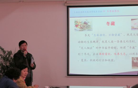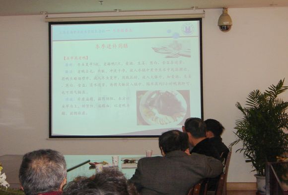 老教师们济济一堂,饶有兴趣地边观看PPT边听刘老师讲述中医保健养生的常识,有些老师还认真的做着笔记,写下要点。老师谈到:“天人相应乃养生之本”人秉天地之气而生,四时之法而成,遵循着“春生、夏长、秋收、冬藏”的原则。时值冬季,俗话说,冬季进补,上山打虎。可究竟补什么好呢? 老师介绍了一些食补的良方,中医食疗本是我国医疗保健的宝贵财富,巧妙食之,可收到事半功倍的效果。他介绍的冬季锻炼健身的三原则等,也让老师们听得津津有味,颇受启发。让身体更健康,能以更充沛的精力投入到工作学习中去,是大家的共同愿望,老师的讲座无疑使大家受益匪浅。