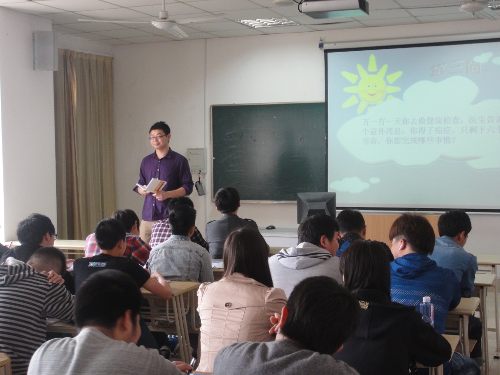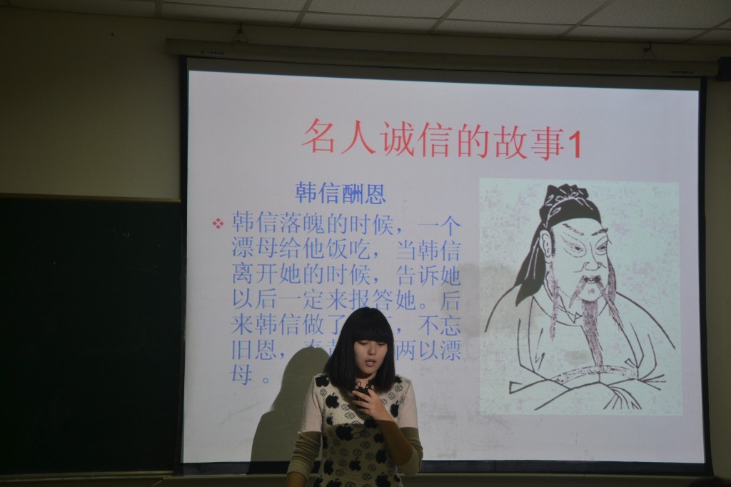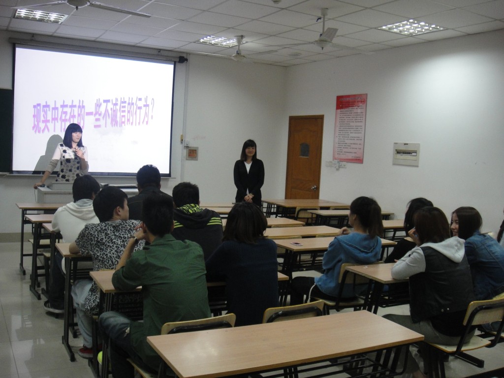 18日下午,何东瑾老师以“建立自信,我就是未来”为题,为国商11级召开班会。自负与自卑一直是影响学生学习与发展的常见问题。对于这一问题,何老师首先邀请学生表演小品,结合实际说明自负与自卑的弊端。又请全体同学参加心理测试,了解自身的信心状况。还通过让学生自写缺点,互写优点的方式。让同学们认清自己的优缺点。一系列的活动让学生豁然开朗,重新审视了自我。