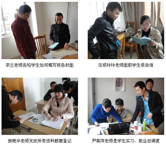 除了2012年11月上旬对学生进行毕业实习总动员以外,商贸学院还要求学生在近8个月的毕业实习期间,集中返校四次。分别是2012年12月14日,(活动内容主要是寒假前再动员,报告实习单位,公司名称,公司地址,公司电话,汇总就业信息);2013年3月1日(活动内容主要是新学期注册,报告实习单位,公司名称,公司地址,公司电话,汇总就业信息);2013年4月19日(活动内容主要是(1)提交盖有实习单位公章并作出评价意见的《实习实训评价表》;(2)交流实习体会;(3)教师指导《毕业实习报告》的写作;(4)汇总就业信息);2013年5月10日(活动内容主要是交流实习情况,布置毕业前补考安排,汇总就业信息)。