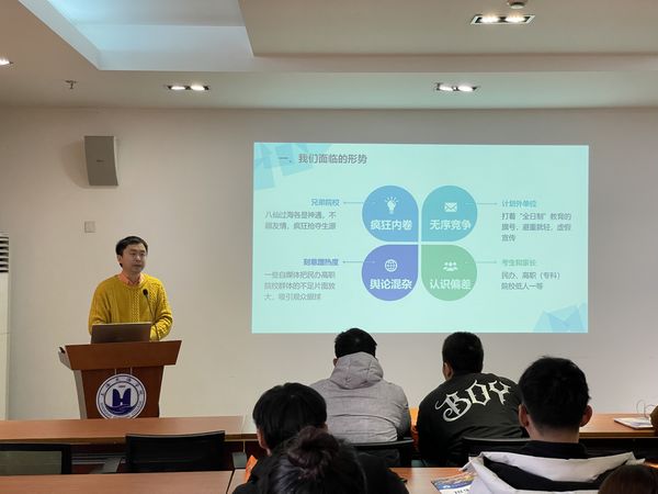 首先,副校长郁萍为本次培训会作动员讲话。郁萍结合学校“五育融合”举措精神,号召全体志愿者充分发挥自身的特长和优势参与到学校招生宣传工作中。通过回访中学母校,结合自身在大学里的学习经历,进行朋辈互动,帮助母校的学弟学妹了解大学,宣扬东海特色,分享东海生活。招生办公室主任蔡建平分析了当前招生工作面临的严峻形势,强调招生宣传工作的重要性和紧迫性。蔡建平给志愿者们分享了招生宣传工作中需要做到的要点,建议大家可从基本情况、升学就业、教学特色、校园生活等方面开展宣讲活动,同时提醒志愿者们在返校宣讲过程中要关注疫情情况,做好个人防护。招生办公室刘静将学校的基本概况、招生类型、招生专业和就业升学情况作了介绍,希望在座的志愿者们通过自己跟母校的这份联系,清晰、精准地将东海精神、东海专业特色和东海校园生活传递进各个中学,让更多的学子知晓我们,报考我们。