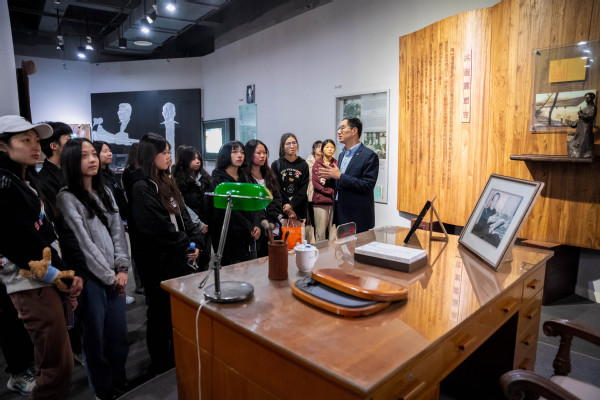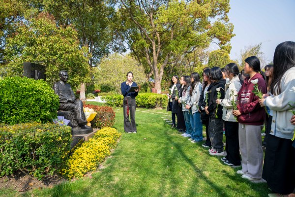 在福寿园人文博物馆内,当讲解员指引同学们辨认1964年那张珍贵合影时,大家凑上前,在合照前排右侧找到了一个有着慈祥面孔的瘦削身影。在讲解员的细心解说下,夏征农先生“半是战士半书生”的传奇人生画卷徐徐展开——这位1926年入党的百岁革命家,既是南昌起义的参与者,又是左联后期领导人,更在晚年以耄耋之龄主持《大辞海》编纂,接着,同学们来到镌刻着先生诗志的墓碑前,深切感受着这位东海学院奠基人“一行政治一行诗”的精神品格。在松柏环绕的墓区,大家敬献白菊,同学们朗诵的纪念短文与铜像上先生深邃的目光交织,将筚路蓝缕的办学往事与新时代青年的思考联结成跨越时空的对话。