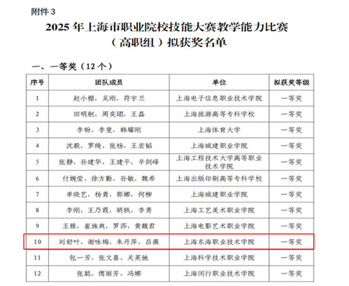 此次获奖彰显了东海学院在职业教育改革与创新中的突出成效,展现了学校对接数字经济时代需求、培养高素质技术技能人才的鲜明特色。学校将以此次比赛为契机,继续深化“以赛促教、以赛促学”机制,推动教学理念与产业实践的深度融合,进一步提升教师教学能力和人才培养质量,为服务上海市职业教育高质量发展和国家战略需求贡献更多力量。(通讯员 曹嘉珉)