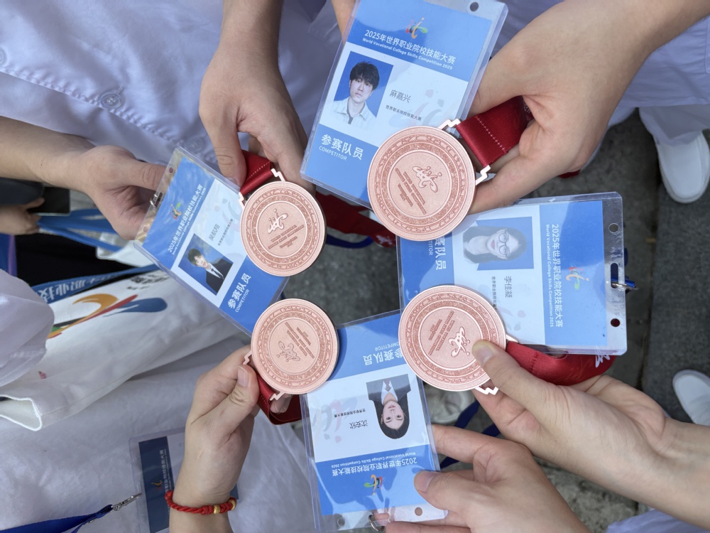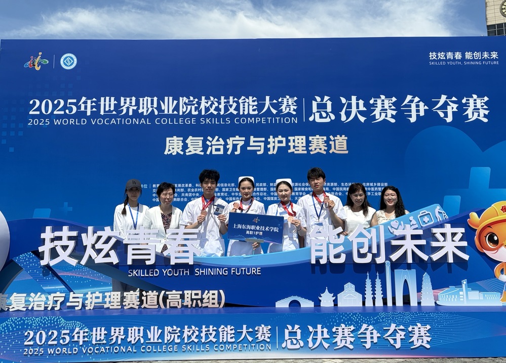 近日,2025年世界职业院校技能大赛总决赛争夺赛康复治疗和护理赛道(高职组)落下帷幕,上海东海职业技术学院护理学院麻嘉兴、吴航翔、沈安欣、李佳凝4位同学凭借扎实的专业技能和严谨的职业态度,斩获铜奖,为学校争光添彩。