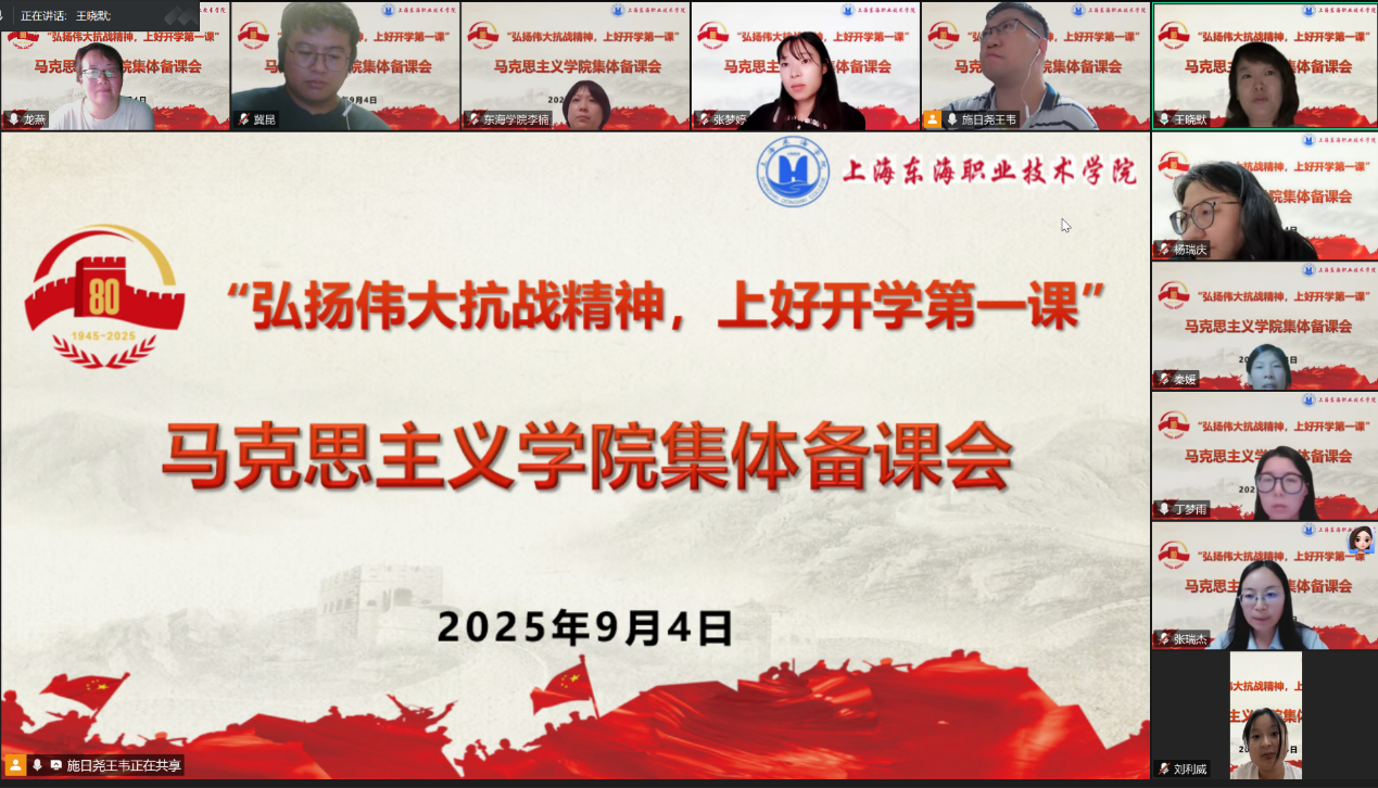 新学期将至,马克思主义学院于9月4日晚通过视频会议系统召开线上集体备课会。本次会议由院长龙燕主持,全体教师线上参会,重点结合9月3日中国人民抗日战争暨世界反法西斯战争胜利80周年纪念活动,围绕“弘扬伟大抗战精神,上好开学第一课”主题展开深度研讨,旨在为新学期思政课注入红色精神内核。