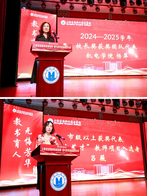 2024-2025学年“校长奖”获奖团队代表、机电学院院长杨萍,与“2024年东方英才计划”教师项目入选者吕薇,分别在大会上发言。