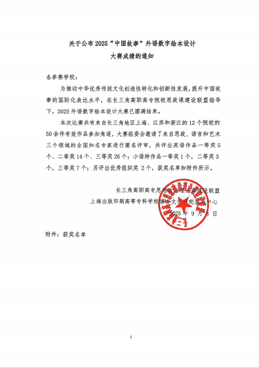 在2025年“中国故事”外语数字绘本设计大赛中,上海东海职业技术学院学生表现出色,斩获佳绩。学校选送的5件作品全部获奖,包括一等奖1项、二等奖1项、三等奖3项,展现了学校在中华文化国际化传播与外语教学方面的扎实成果。
