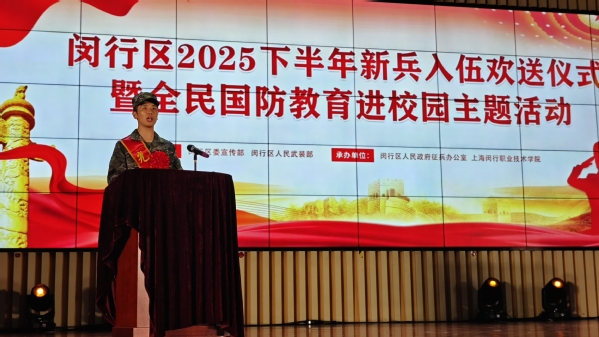 我校信息工程学院计算机应用专业2022级学生王庆鑫作为闵行区新兵代表发言。他眼神坚定地表态:“作为上海东海职业技术学院的一名学子,我将牢记母校嘱托,在军营中刻苦训练、锤炼本领,努力成长为‘有灵魂、有本事、有血性、有品德’的新时代革命军人,为母校争光,为强军事业贡献力量。”最后,他代表全体新兵郑重承诺:坚决服从命令、严守部队纪律,不怕苦累,用实际行动为部队建设贡献力量。现场新兵以“正义必胜、和平必胜、人民必胜”响亮的口号回应共鸣,这份新时代大学生参军入伍的家国情怀,让在场的家长和送兵的老师们动容,掌声雷鸣。