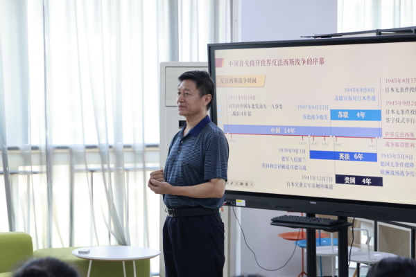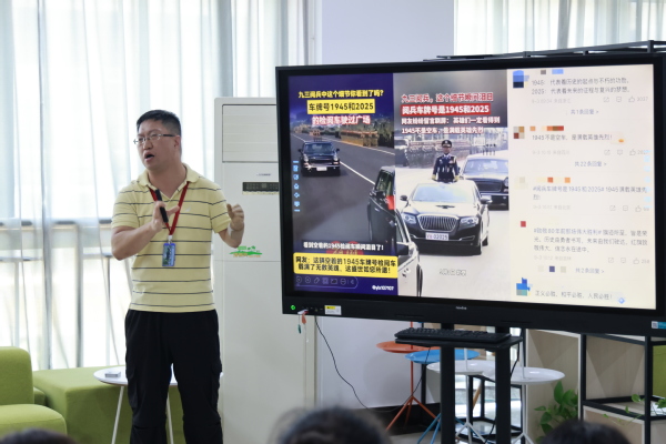 活动中,施晓玮带领师生简要回顾抗战历程,深刻解读伟大抗战精神的内涵,从爱国情怀、民族气节、英雄气概、必胜信念四个维度展开深度解析;梁艺馨从“正义胜利、和平胜利、人民胜利”等维度分享九三阅兵心得,将正义的信念、和平的追求、人民的立场,深深植入学生心田,引导他们在新时代的奋进之路上,书写无愧于历史的青春华章;王斌从九三阅兵中看新时代国家安全观,希望同学们能深刻理解“国之大者”,自觉将个人技能报国、专业报国的志向融入国家发展大局,练就过硬本领,涵养家国情怀,时刻准备着为维护国家安全、促进民族复兴贡献自己的智慧和力量。