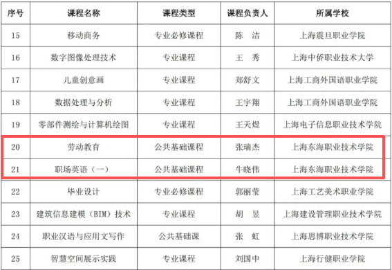 近日,上海高职高专课程思政与文化素养教指委公布了《关于2025年度上海市高职高专课程思政优秀课程建设(原课程思政示范课程项目)立项通知》,我校《劳动教育》《职场英语(一)》两门课程获批培育项目。