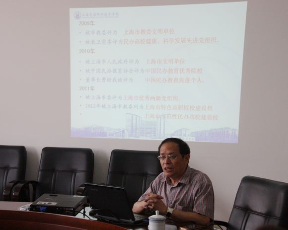 校长项家祥对我校师资队伍建设、办学管理制度、教学工作等方面的内涵建设作了专题汇报。目前,全校师生正在齐心协力,正规有序地积极创建市级特色高职院校、示范性民办院校和文明单位(和谐校园),并对闵行区领导对我校建设的高度重视、大力的资金支持和帮助表示深深的感谢。他表示:我校各项建设都在有条不紊的进行着,并且初见成效,相信在闵行区政府的大力支持下,全校师生共同努力,学校目标一定能实现。
