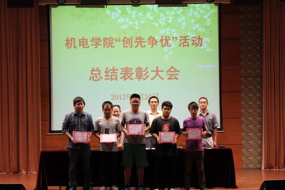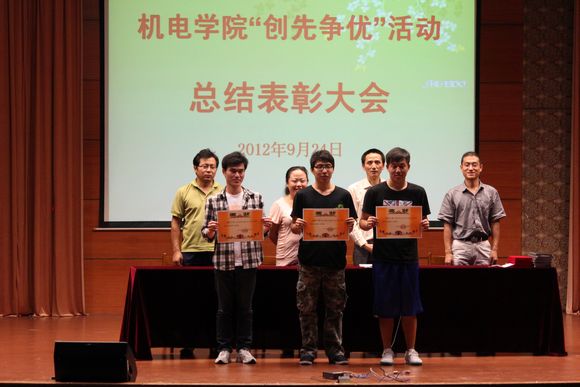 9月24日晚,机电学院在多功能报告厅举行了2011—2012学年第二学期“创先争优”工作表彰总结大会。机电学院党支部书记蒋久泉老师总结了我院党支部开展的“双结对”活动、“易班”学生党建工作、“读好书”活动、“文明班级”和“优秀班干部”评选活动以及“党员示范岗”活动等系列活动的开展,使机电学院的文明建设、学风建设取得了长足进展,为和谐校园建设营造了良好的氛围。同时,大会为获得“文明班集体”、“优秀班干部”的集体和个人进行颁奖。最后,党支部鼓励2012级新生们要以高年级同学为榜样,努力学习专业知识,取得好的成绩。