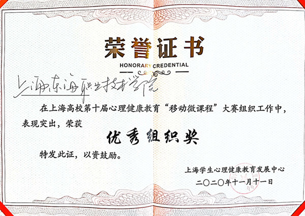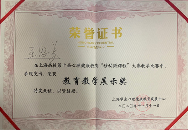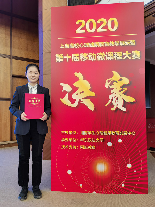 在11月11日于华东政法大学举行的上海高校第十届心理健康教育移动微课程大赛上,我校辅导员王思美参赛并获“教育教学展示奖”,我校同时荣获优秀组织奖。