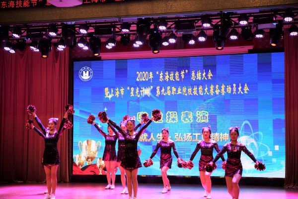 党委副书记王玉、副校长郁萍分别为获奖师生代表颁奖。我校啦啦操队队员用精彩的啦啦操表演表达了对获奖师生的祝贺。中华人民共和国第一届职业技能大赛金牌获得者朱珂作为学生代表发言;艺术设计学院教师陈超作为“东海优秀指导教师”代表发言。