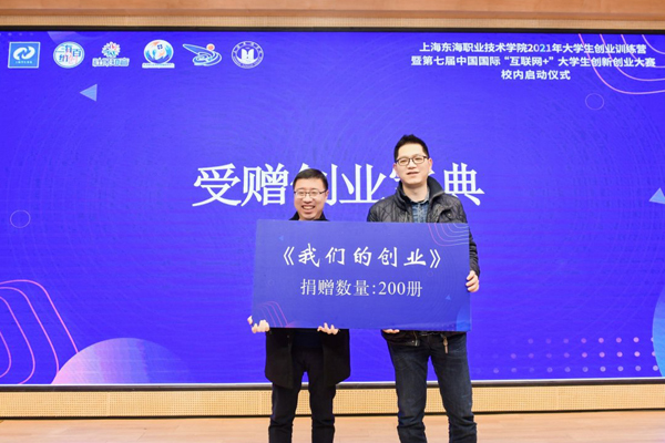 学校的双创工作离不开社会各界的大力支持。仪式上,戚永康代表上海市大学生科技创业基金会向学校捐赠了200册《我们的创业》,期待能在创新创业道路上为东海学子提供更多指引;潘祥胜和郁萍则共同为上海东海职业技术学院-大树下园区校外创业实践基地揭牌,潘祥胜更是现场承诺向东海学子们提供四大优惠政策,全力助推东海创业先锋追逐梦想。