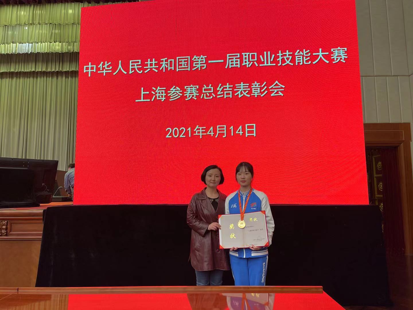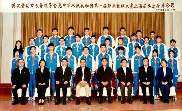4月14日下午在上海展览中心友谊会堂召开的首届全国技能大赛上海参赛总结表彰会上,上海东海职业技术学院货运代理项目金牌选手朱珂和时装技术项目第五名选手马梓轩接受市领导接见,并代表获奖选手上台领奖。