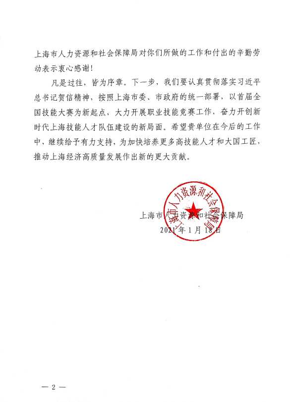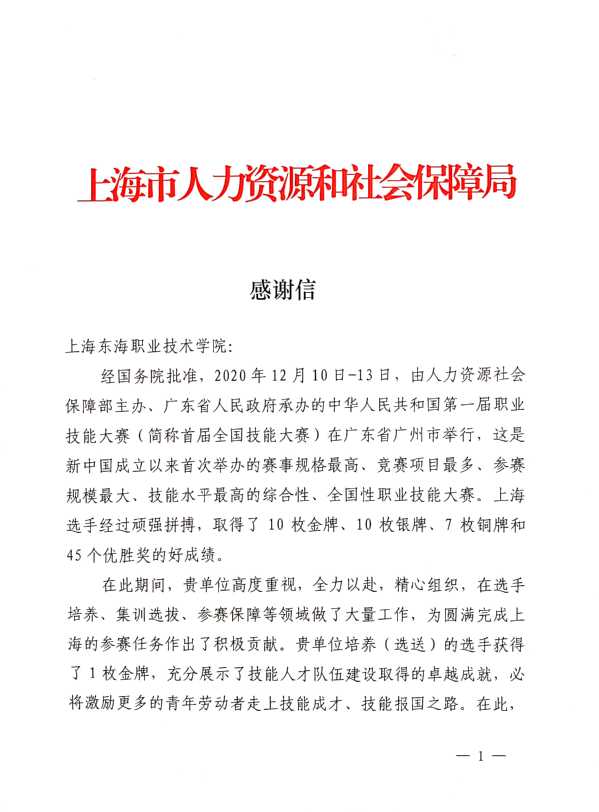 上海市人力资源和社会保障局向我校发来感谢信,感谢学校在大赛选手培养、集训选拔、参赛保障等领域作出的工作,及为圆满完成上海参赛任务作出的积极贡献。感谢信说,“贵单位培养(选送)的选手获得了1枚金牌,充分展示了技能人才队伍建设取得的卓越成就,必将激励更多的青年劳动者走上技能成才、技能报国之路。”