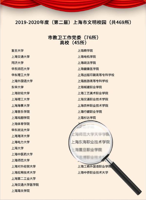 市文明办3月27日公布沪文明城区、文明行业、文明单位、文明校园名单,我校为2019—2020年度(第二届)上海市文明校园。至此,我校已十二年蝉联六届“上海市文明单位”荣誉称号。