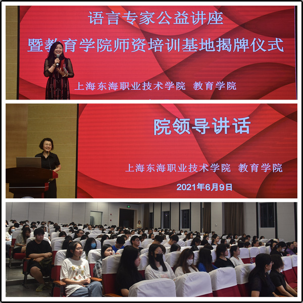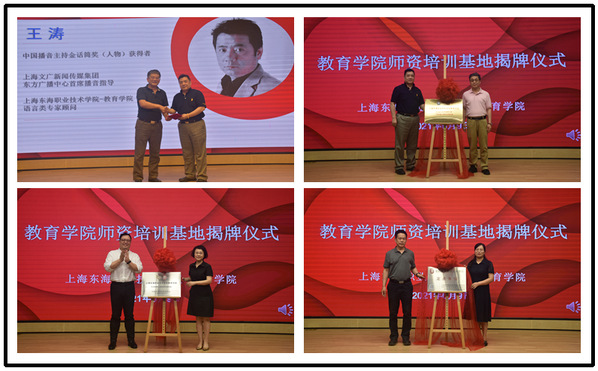 6月9日晚,我校教育学院语言专家公益讲座暨师资培训基地揭牌仪式隆重举办,校长王刚、教务处处长何民乐出席,中国播音主持金话筒奖获得者、上海文广集团东方广播中心首席播音指导、国家级语言艺术表演专业考官王涛,上海人民广播电台Radiokids节目负责人、主任编辑贾娴,北京舞蹈学院中国舞师训上海地区负责人、中国艺术职业教育学会歌舞专委会理事、中国艺术职业教育学会——上海人民广播电台语言艺术产教研融合示范基地项目总监陈加力,中国艺术科技研究所社会艺术水平考级美术考级上海考区主任李作功作为嘉宾应邀出席。教育学院领导师生代表300人共同参加。