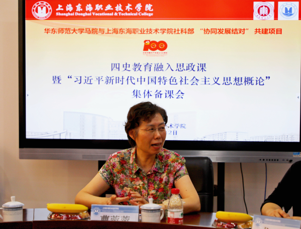 为深入学习宣传贯彻习近平总书记“七一”重要讲话精神,社科部积极邀请华东师范大学马院教授们来我校推进“协同发展结对”项目建设。7月12日下午,两校教师开展了“四史教育”融入思政课暨“习近平新时代中国特色社会主义思想概论”集体备课会,备课会由社科部副主任龙燕主持。我校党委书记曹蓉蓉到会并对华师大专家一行表示感谢和欢迎,她特别感谢华东师范大学马院在“协同发展结对”项目建设半年以来,华师大教授们来我校进行讲座、研讨,对我校思政师资教学和科研的极大帮助。希望未来在协议框架下,合作更加深刻,教学改革能更加紧密和多样化。
