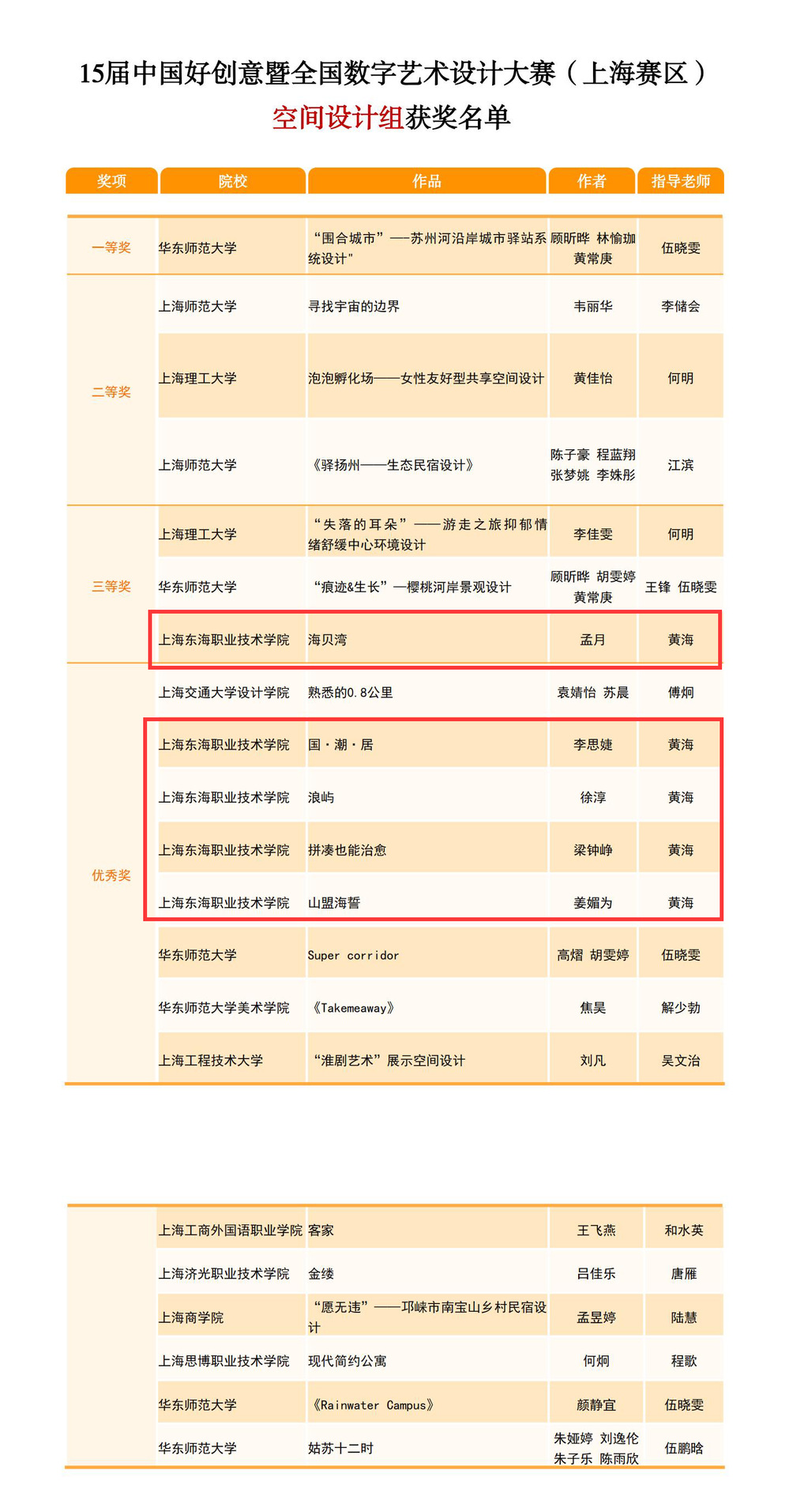 近日,第十五届“中国好创意”暨全国高校数字艺术设计大赛评选工作落下帷幕,艺术设计学院学子在本次比赛中再获佳绩,上海市空间设计组三等奖一名、优秀奖四名,黄海老师获优秀指导教师奖。