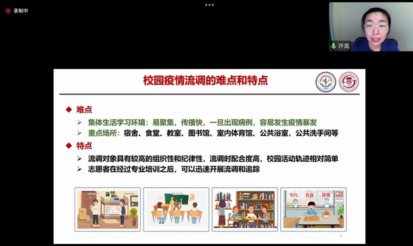 随后《新型冠状病毒肺炎防控方案》(第九版)编写组成员许岚、徐雅晴两位老师就流调方法与技巧进行了深入讲解。她们强调,流调工作与全校师生的健康安全息息相关,需要医务、人事、学工、信息、安保、消杀等各组协同作战,才能达到“早、快、准”的流调目的。高校做流调,不是为了替代疾控工作,而是为了尽快溯源,阻断校内传播链。因此高校流调人员要有高度责任心和耐心,不能有主观判断,更不能被流调对象的情绪所影响。流调过程要简洁、高效、精准。培训中两位老师对流调过程进行了模拟演绎,再次强调了“尽快找到密接才能更快阻断传播链,更好地自保”这一流调目的。同时耐心解答了我校流调志愿者在前期分组模拟中遇到的疑问,让大家受益匪浅。