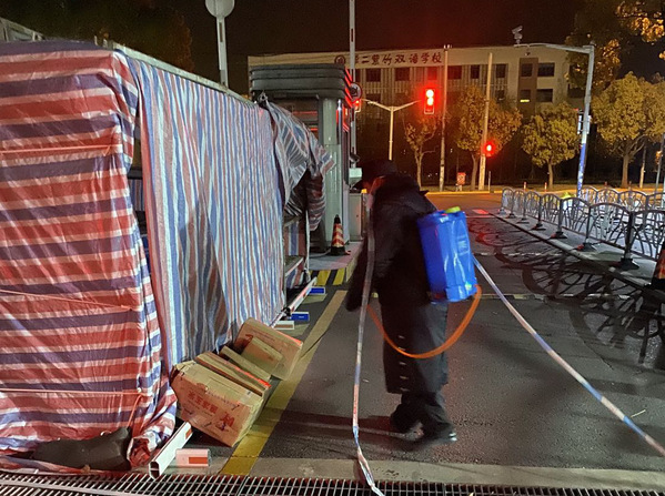 保卫处的同志组织门卫安保人员,严格落实防控要求,认真检查登记每位进出校的人员信息,严格落实进校生活保障物资、防疫应急物资消毒,在缓冲再搬运。特别是食堂的保障物资常常是深夜或凌晨送到,安保人员丝毫不懈怠,认真按照要求登记、消毒,展现了良好的主人翁意识、服务意识和全局意识。