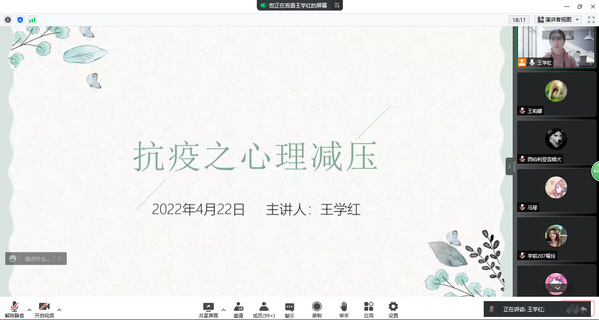 4月22日晚7时,心理中心邀请国家三级心理咨询师、校兼职心理咨询师王学红,开展“抗疫之心理减压”主题沙龙活动,并就学生提问,给予一对一答复。共有250余位学生参与。