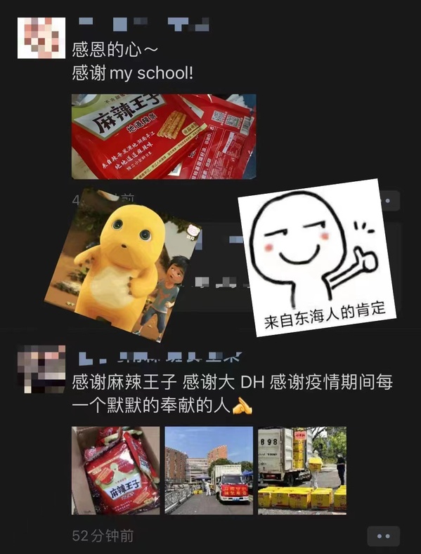 据悉,4月17日,麻辣王子的上海员工给全楼邻居送辣条,受到网友关注。不少上海高校学生表示希望麻辣王子也能“看看自己的学校”。一时间,辣条备受学生们关注。在我校航空学院教师对接下,麻辣王子按照每位在校学生送110g大包辣条的量捐赠。拿到辣条的那一刻,东海学院的师生们纷纷为麻辣王子点赞,感谢麻辣王子为自己疫情下的生活带来“麻辣”体验,祝福麻辣王子产品越来越好,品牌知名度越来越高。(通讯员 刘会娟)