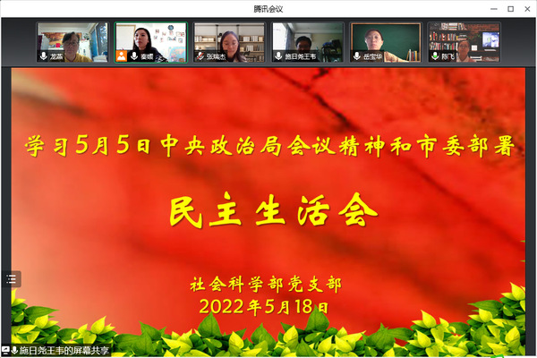 5月18日,社科部党支部召开线上民主生活会,专题学习5月5日召开的中共中央政治局常务委员会会议重要精神。社科部党支部6名党员到会参加学习(1人病假)。