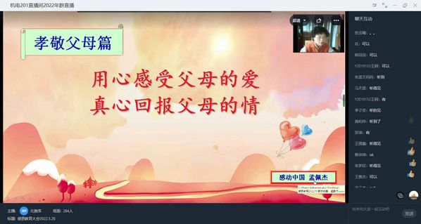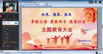 5月20日下午,“孝敬父母、尊敬师长、感恩社会主题教育大会”通过钉钉平台在云端隆重召开,大会由学院党支部书记尤逸萍主播,全体师生参加了大会,学生家长也受邀一起收看收听了大会直播。 大会以感恩教育为主线,通过孝敬父母、尊敬师长、感恩社会三个板块对学生进行社会主义核心价值观教育。