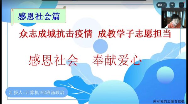 在感恩社会篇,播放了学院制作的短视频《向可爱的学生志愿者致敬》,展现了学院15位学生志愿者的风采。他们舍小爱为大爱,他们主动请缨,在各自的岗位上弘扬了“奉献、友爱、互助、进步”的志愿者精神,他们以饱满的热情、强烈的责任感投身到抗疫一线,用实际行动践行了“感恩社会、奉献爱心” 的社会主义核心价值观。两位志愿者代表交流演讲了他们的体会和感想。《以感恩之心加入守护学校安全的抗疫志愿者队伍》讲述了学生主动留校帮助网络中心老师一起守护学校安全的感人故事。《感恩社会、传递爱心——我的一百天志愿者经历》讲述了学生参与医院疫情防控工作,坚守岗位一百天的感人故事,一百天志愿服务经历,支撑她坚持不懈的动力,不仅是她的爱心,还有父母的支持和鼓励。大会请到了学生的妈妈连线感言,“能尽自己微薄的力量为社会做一点贡献是很幸运的一件事”,这是妈妈教育孩子的话。全场被母女爱心的传递所感动。