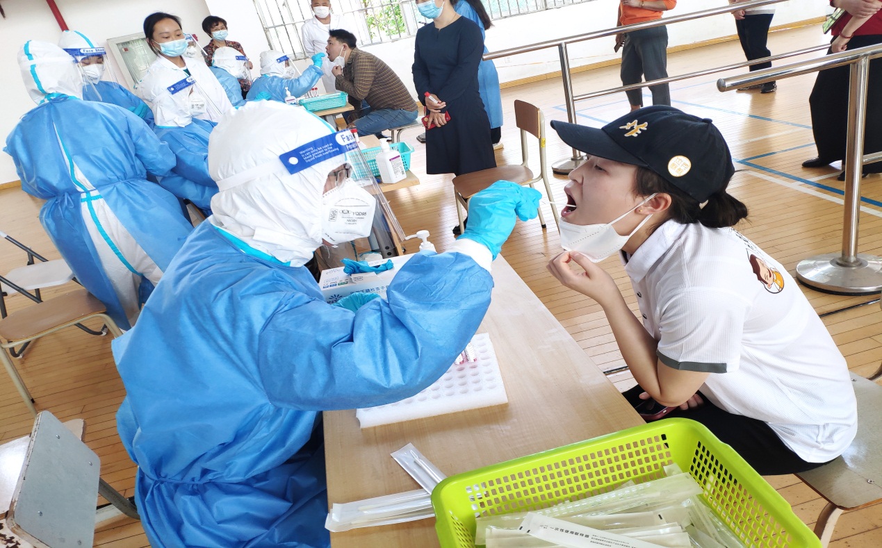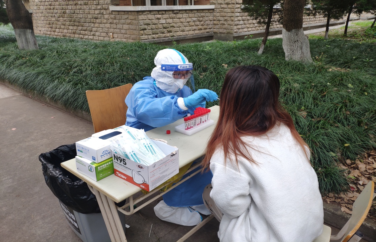 “同学,请把头稍微抬高一些,很快就好了。”在1号楼前,经管学院党支部书记许小梅第一次给学生们做核酸采样,此前她已经接受2次专业培训和带教。