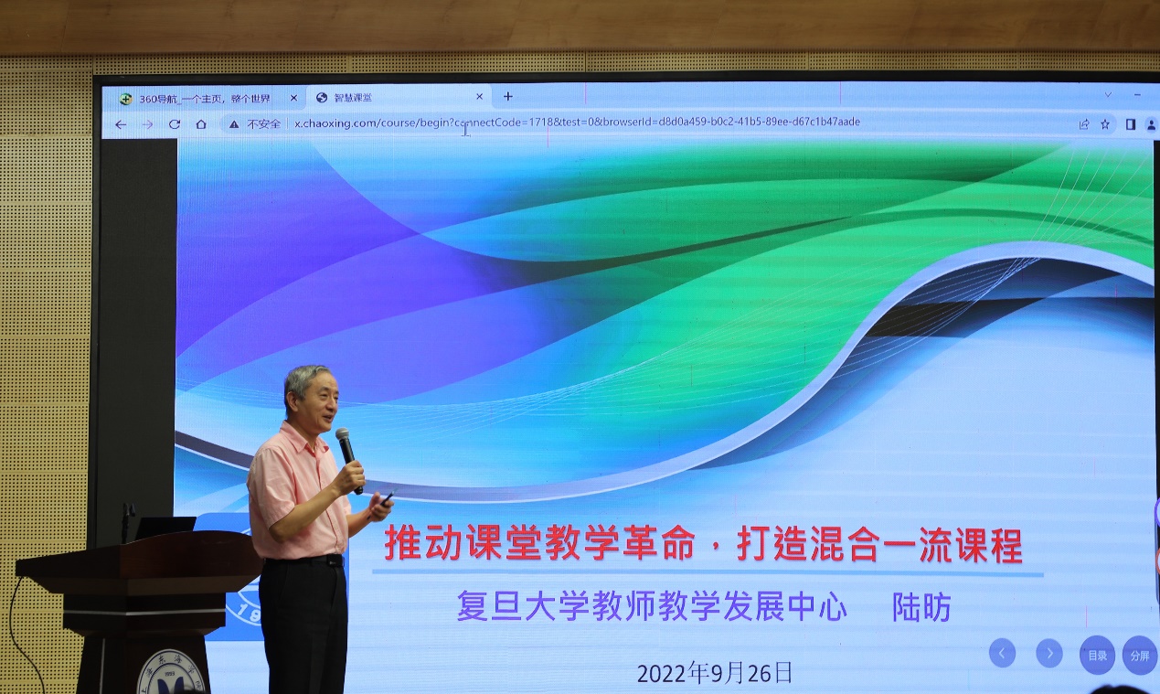 会上,复旦大学原副校长,现任复旦大学教学指导委员会主任委员、教师发展中心主任、腾飞书院院长陆昉教授应邀作“推动课堂教学革命,打造混合一流课程”专题讲座,从“打破传统以教为主的课堂教学”“打造线上线下混合式一流课程”“如何推进混合式一流课程建设”三个方面对“混合式教学”的内涵进行了系统阐述。会场气氛严肃安静,听众者聚精会神,仔细笔记、认真思考。
