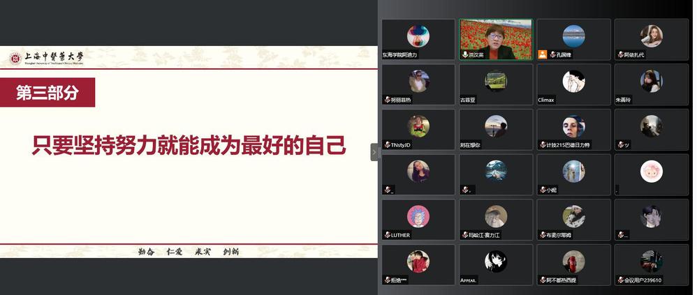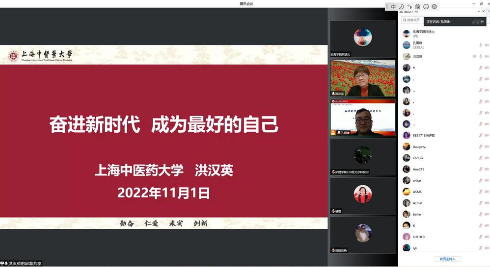 11月1日,我校邀请全国模范教师、十八大代表、上海中医药大学少数民族学生辅导员、上海市辅导员工作室“洪汉英工作室”主持人洪汉英副教授线上作题为“奋进新时代 做最好的自己”主题讲座。学工部部长杨瑾、学工部新疆办主任孔国锋、少数民族专职辅导员及全体22级少数民族学生参加。