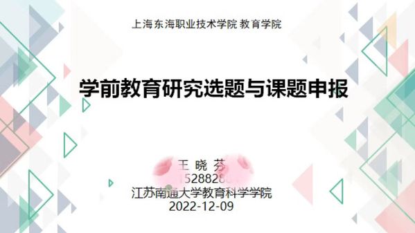 12月9日下午,教育学院客座教授、南通大学教科院学前教育王晓芬教授应邀在线作《学前教育研究选题与课题申报》专题讲座,教育学院全院教职工聆听了本次讲座。