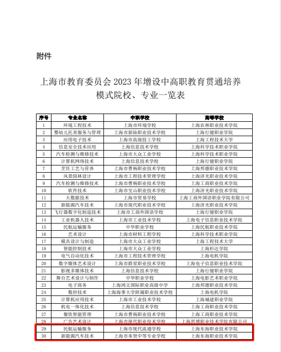 近期,市教委发布了《上海市教育委员会关于2023年增设30个专业点开展中高职教育贯通培养模式工作的批复》(沪教委职〔2023〕5号)的通知,我校民航运输服务和新能源汽车技术两个专业点获批(详见下表)。至此,我校中高贯通培养模式试点增至20个,贯通培养中职校共计9所。中高职贯通培养模式不仅丰富了学校的办学层次、优化了学校的专业布局,更为学生素质和学历提升搭建了成长平台。我校将进一步切实加强中高职贯通培养模式的管理,深入推进与各贯通高校的交流合作,不断深化教育教学改革,全面提升人才培养质量。