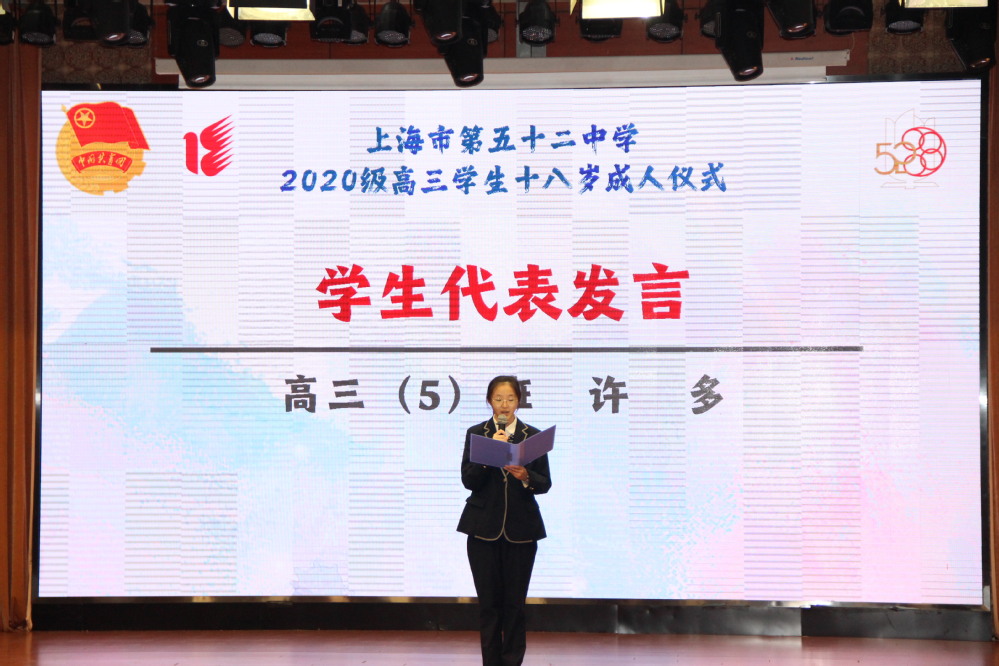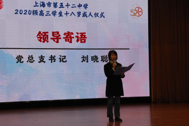 副校长郁萍在学生成人仪式上致辞,代表学校对五十二中学师生们的到来表示诚挚欢迎,对同学们成年致以衷心的祝愿。郁萍简要介绍了我校自建校以来的发展情况,并寄语在座的同学们珍惜高中时光,努力拼搏,志存高远,如愿考上心中理想的大学。