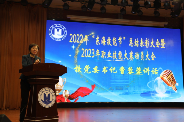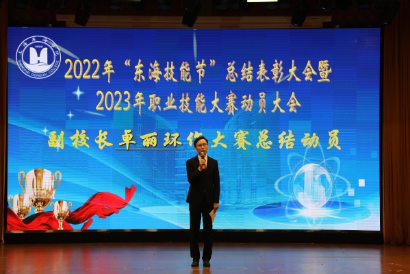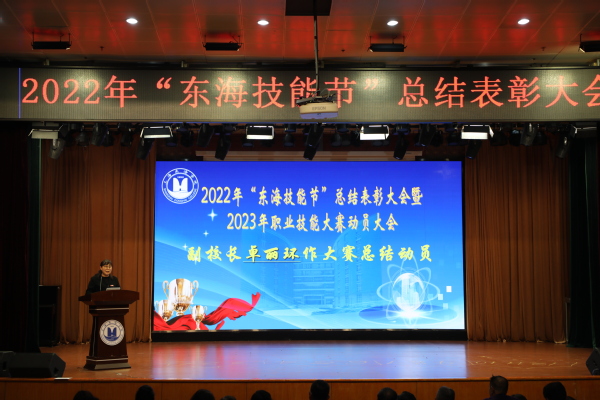 首先,副校长卓丽环作2022年“东海技能节”参赛总结报告,并对2023年参赛进行总动员。她总结道,“东海技能节”于2016年正式创立,赛项由各学院(部)为单位自主设计,设计原则一是以高级别、高规格大赛赛项内容为引领;二是根据学情适当调整评判标准。这样的设计原则既能保证绝大部分学生能够参与比赛,亲身感受“技能成就人生,弘扬工匠精神”的职业教育氛围,又可以提高赛项的水准,为市赛、国赛选拔优秀选手。举办7年来,“东海技能节”已成为东海学院“弘扬工匠精神”的核心文化品牌和培育“大国工匠、能工巧匠和技术技能人才”的重要实践平台。2022年“东海技能节”于11月1日正式启动,东海学院全部7个二级学院和基础教学部共设18个竞赛项目,其中对接第十届“星光计划”的赛项 8项。参加竞赛学生数达3279名,其中295位同学获得不同等级的奖项。