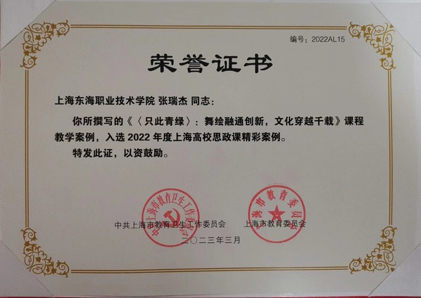 近日,上海市教育委员会分别公布了2022年度上海高等学校一流本科课程名单,2022年度上海高校思想政治理论课“金课”、精彩案例、教师教学大比武优秀教师名单及上海高校思想政治理论课教师研修基地(2022-2024年)入选及拟入选名单。教师张瑞杰的教学案例《只此青绿》:舞绘融通创新,文化穿越千年,喜获精彩案例奖。这也是在《毛泽东思想和中国特色社会主义理论体系概论》课程中,高职高专唯一入选作品。