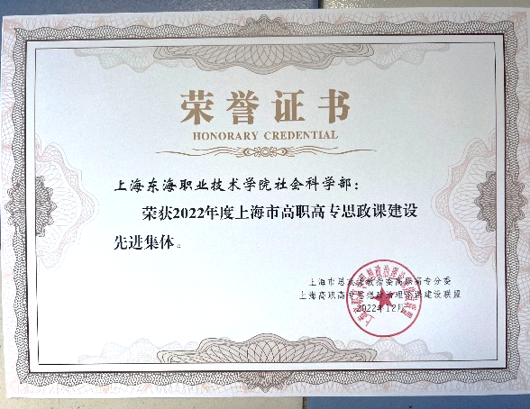 此外,在上海高职高专思想政治理论课建设联盟第六届年会的系列活动中,我校社科部荣获2022年上海市高职高专思政课建设先进集体。教师张瑞杰荣获“教学骨干”称号。