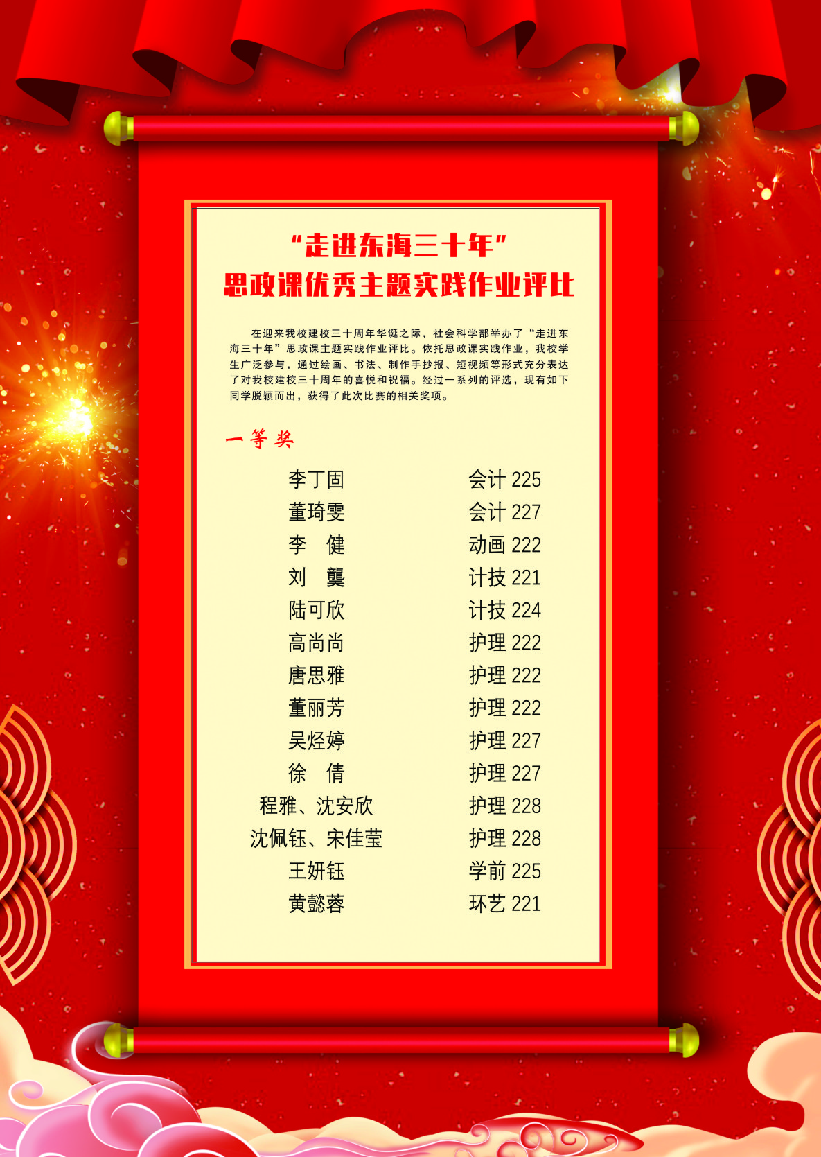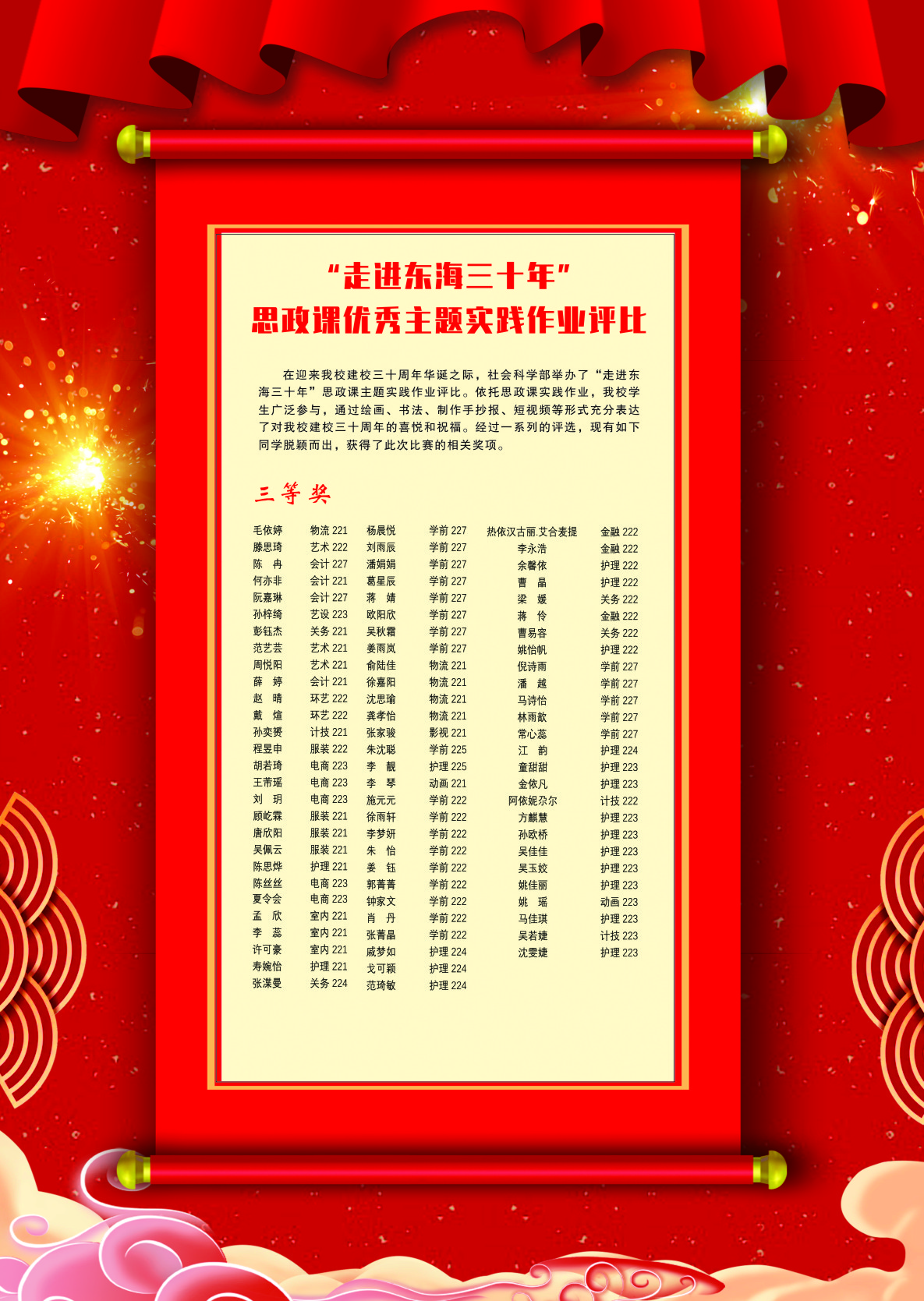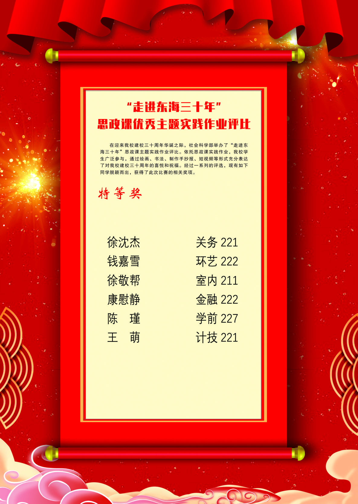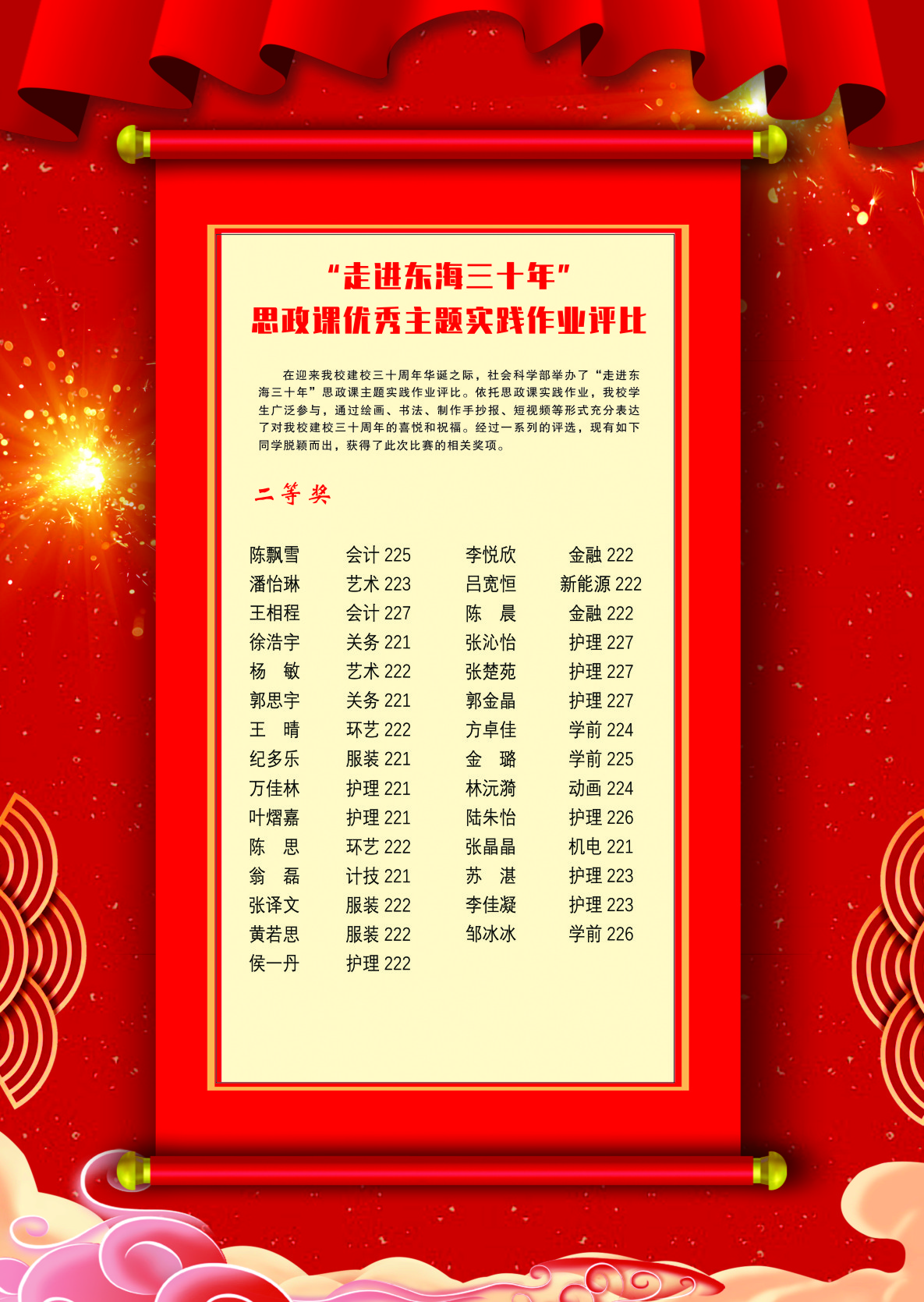 在本学期开学之初,社会科学部教师将这一实践作业在课堂上进行了布置,这既是一次作业,一项评比,同时也是一次主题实践活动。依托思政课实践作业,我校学生广泛参与,通过绘画、书法、手抄报、短视频等形式充分表达了对东海学院建校三十周年的喜悦和祝福。通过这次活动,同学们更加深入地了解了我校三十年创业的艰辛,了解了创立者们的初心,了解了我校校训“自尊自强、认真求真”的内涵和校徽的深刻含义。