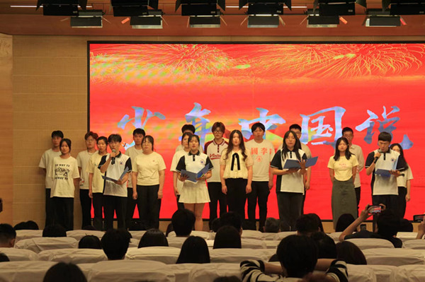 最后,二十个学生铿锵有力的集体朗诵“中国少年说”,把主题活动推向到了高潮,“天地苍苍,乾坤茫茫,中华少年,顶天立地当自强。少年强则国强!”的声音响彻整个报告厅。