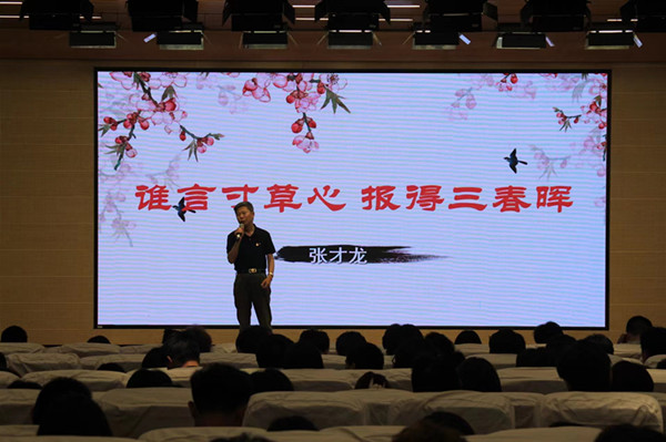 院长张才龙以“谁言寸草心,报得三春晖”为题讲述了他与父母的故事。张院长出生于上世纪50年代的 普通农民家庭,父母省吃俭用,含辛茹苦养育了他们兄弟5人,虽然家境贫寒,但一直支持他们读书求学,希望孩子通过读书改变命运。一九七七年张院长考上了南京师范大学后,父亲那种兴奋激动的情景至今难忘。上世纪八十年代,张院长大学毕业走上工作岗位不久,父母终因劳累疾病先后去世,当时的他尽其所能孝顺陪伴,但是无力回天。讲到此时,张院长忍不住哽咽流泪,全场被感动得一片掌声。最后,张院长说:子欲养而亲不待,希望同学们及时行孝,用努力学习来回报父母的养育之恩。