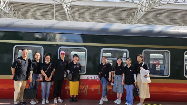 大家一起沿着当年“一大”代表们的足迹,从上海西站出发,乘坐全称为“新时代重走一大路”红色教育主题列车抵达嘉兴,主题列车车底通过普速列车改造而成,全车外部采用红、金、绿配色,既保留古朴的绿皮火车风格,又体现了红色文化元素。列车确定了“不忘初心地”“走新时代路”两大主题,同步将两节车厢改造成红色教育主题功能车厢,设置了“火车邮局区”“火车学习角”、上海党的一大会址及嘉兴南湖红船老照片展示区等。老师们沉浸式体验,感受红色氛围。